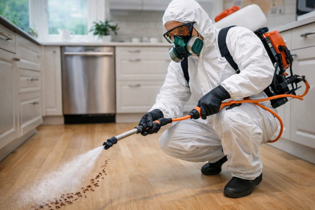 Safe and odorless chemical spray is applied around walls, baseboards, and entry points to kill ants instantly and stop further infestation.
